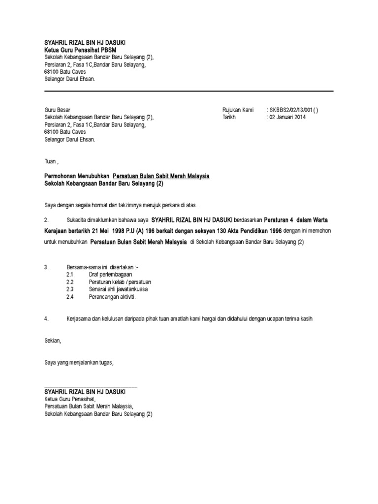 Hamiza bin zaini sk. Guru besar ruj. Contoh Surat Permohonan Penubuhan Persatuan.